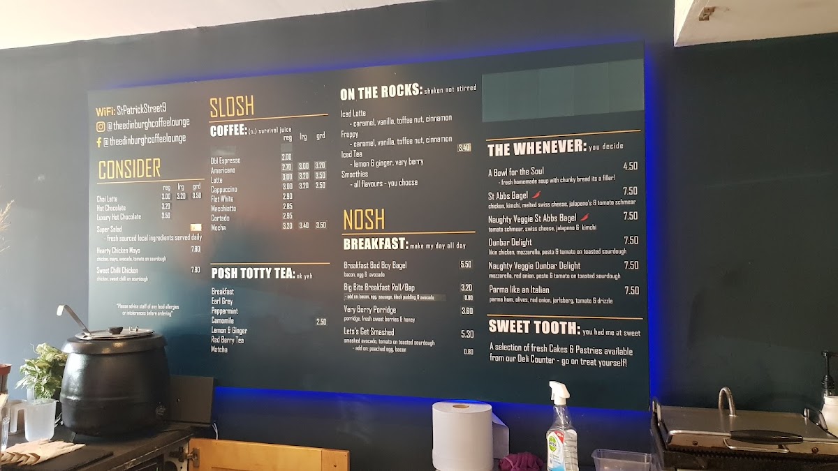 Welcome to The Edinburgh Coffee Lounge, a gem tucked away at 9 St Patrick St, Edinburgh. This delightful spot offers a thoughtfully curated menu that elevates your coffee experience to new heights. From refreshing Iced Lattes and Smoothies under the "On The Rocks" section, to soul-soothing bowls like the A Bowl For The Soul and the delightful St Abbs Bagel, there’s something for everyone.